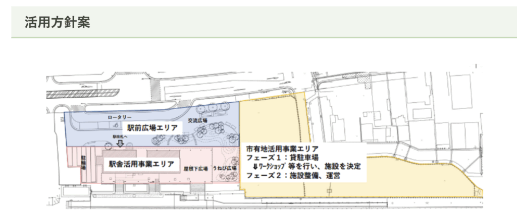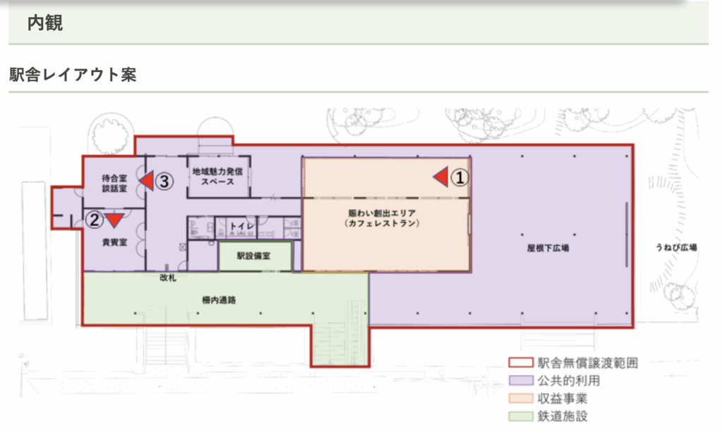 現在の計画では、駅舎内にカフェレストラン等の収益事業を想定しており、改札は西側へ移設。駅舎東側には屋根つき広場と「うねび広場」を整備し、にぎわいを生む空間とする、としています。